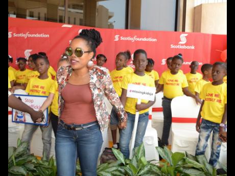 Contributed Queen Ifrica reaches back to hold the hand of an Allman Town student as she participates in the pledge to protect the nation's children, at the launch of ScotiaFoundation activities for child Month on Wednesday at the ScotiaCenter podium. Students from Allman Town Primary (background) carried signs with messages reminding us how we should treat OUR CHILDREN.