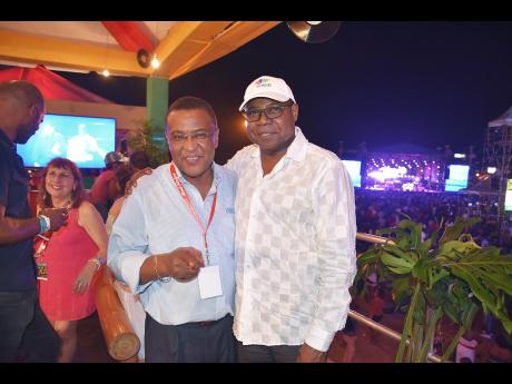Minister of Tourism Edmund Bartlett (left) and Director of Tourism, Paul Pennicook at Reggae Sumfest 25 in Montego Bay, St James..