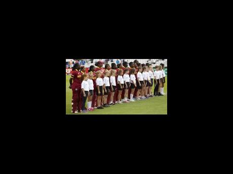 TAUNTON, ENGLAND: Members of the West Indies Women's team stand to attention while listening to the West Indies Anthem 'Rally Roung The West Indies' before the ICC Women's World Cup 2017 match against Australia on June 26.