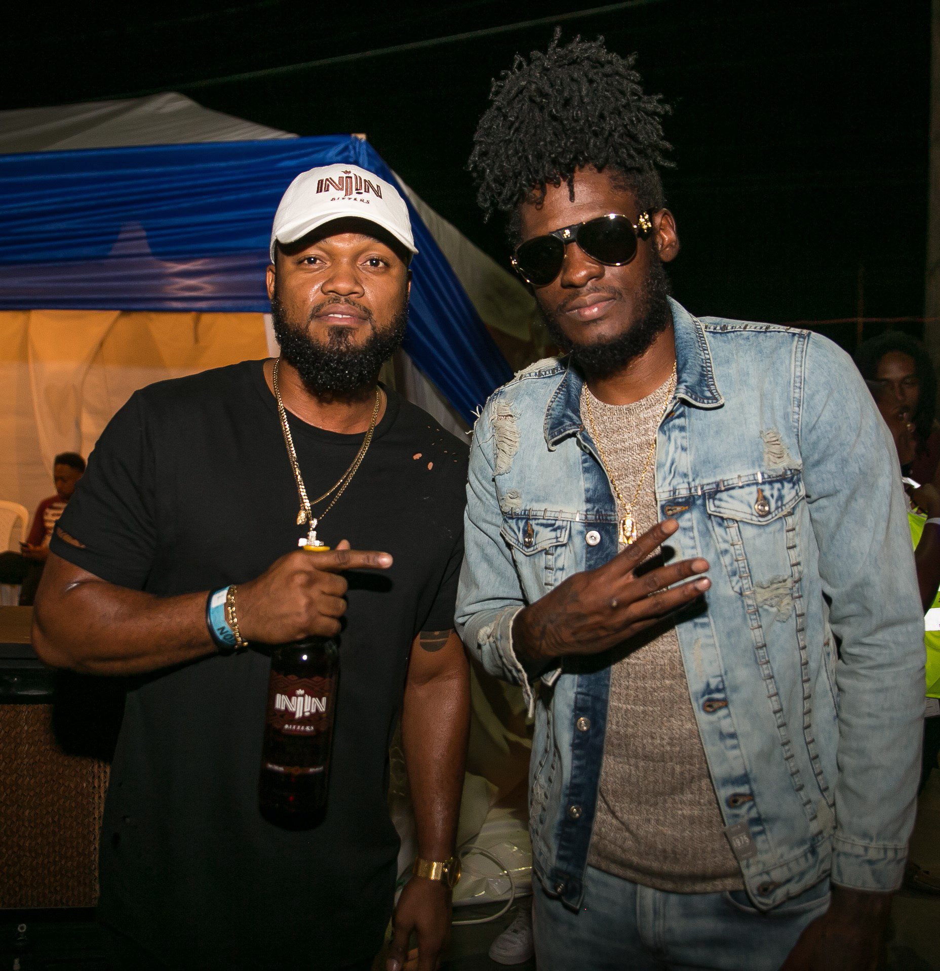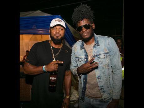 Imru James (left), brand manager for stouts and Malta at Red Stripe, takes a photo op with deejay Aidonia moments before his performance at the Pepsi Refresh Tour.