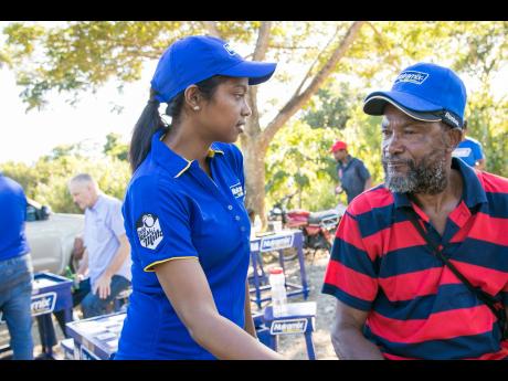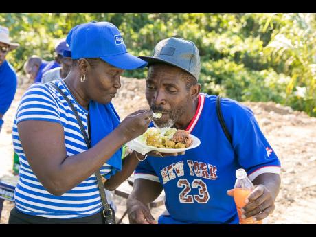 A resident of Seaforth in St Thomas feeds a farmer with his meal.