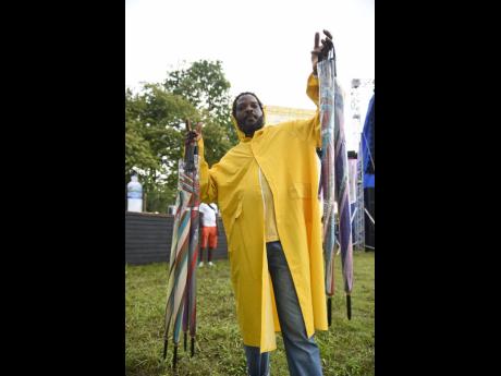 Junior, the umbrella man, who is known for being ready for any storm, has been scanning the venue to find persons willing to purchase umbrellas as well as plastic phone protectors.