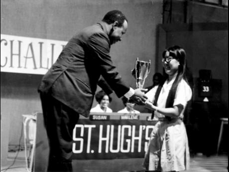 Captain of St. Hugh's collects the JBC's Schools Challenge Quiz trophy from the General Manager Mr. Wycliffe Bennett in 1970.