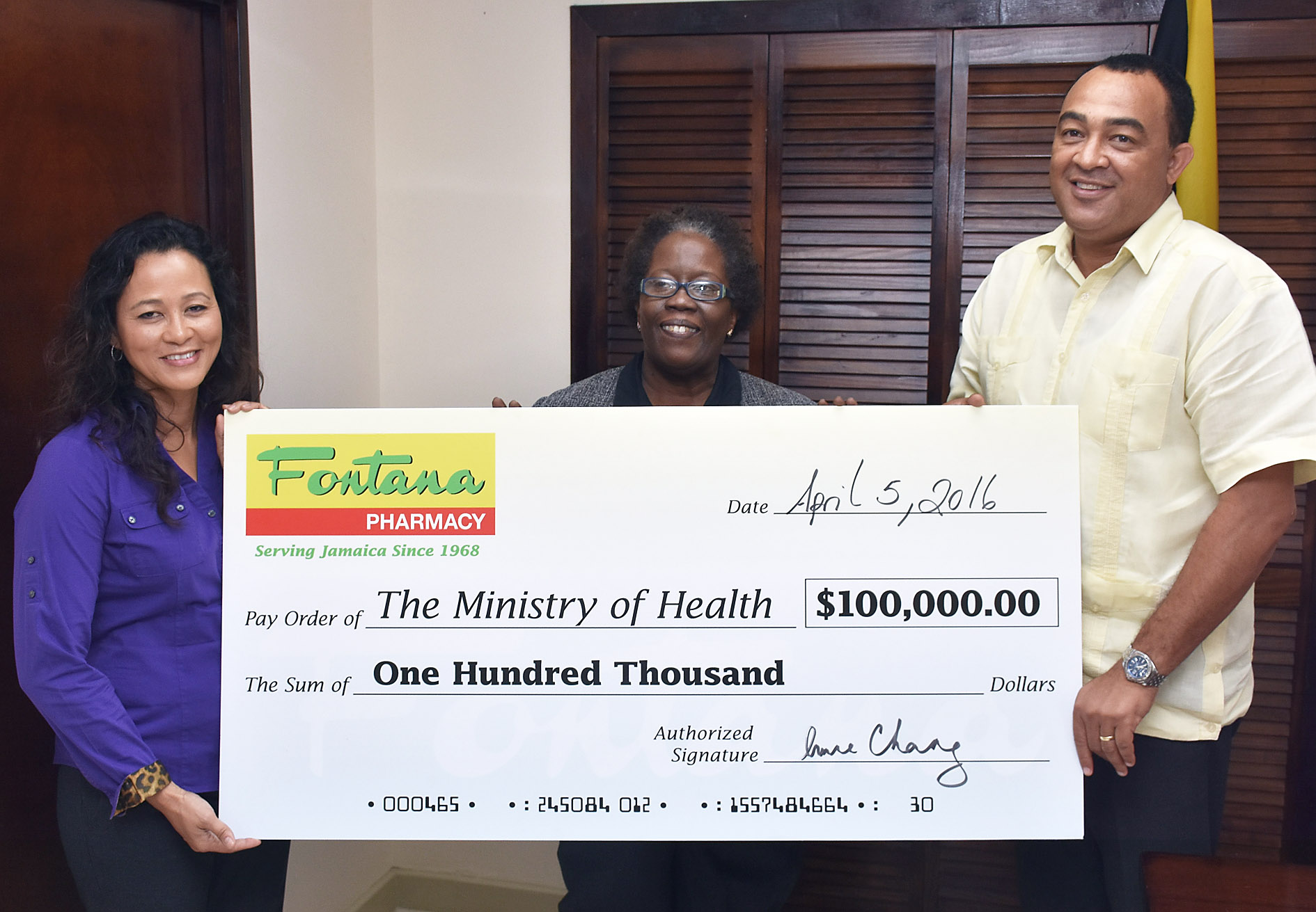 Fontana Pharmacy donated has $100,000 to the Ministry of Health to assist in fighting the Zika virus. Fontana Pharmacy also developed an educational flyer about Zika prevention. Minister of Health, Dr Christopher Tufton, expressed thanks for the ongoing support to fight Zika virus as he accepted the cheque during a brief presentation on April 5 in the conference room at the ministry, Grenada Way, Kingston 5.
