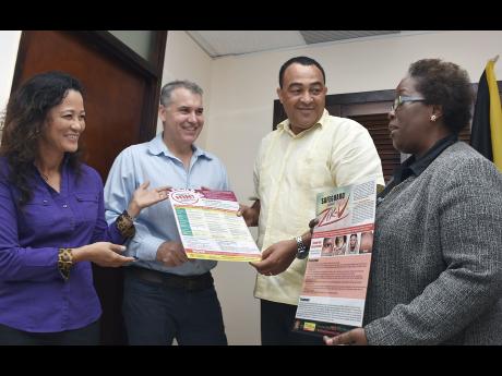 Contributed Minister of Health, Dr Christopher Tufton (second right), listens as Director of Health Promotion and Protection in the Ministry, Dr Sonia Copeland (right), comments on the Zika education flyer developed by Fontana Pharmacy with support from the ministry. Others (from left): are directors of Fontana Pharmacy, Anne Chang and Ray Therrien.