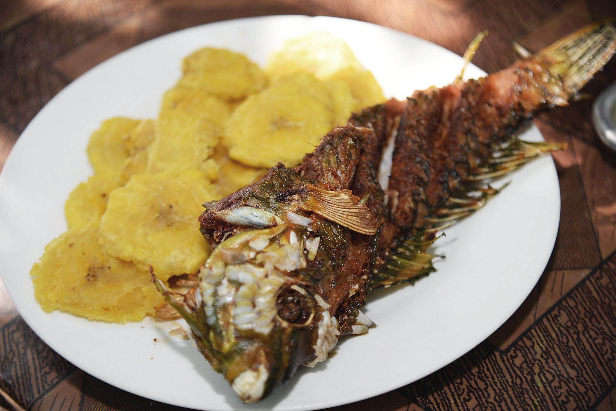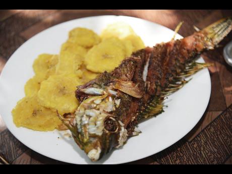A typical meal from D'Lillian's includes fried fish and fried green plantains.