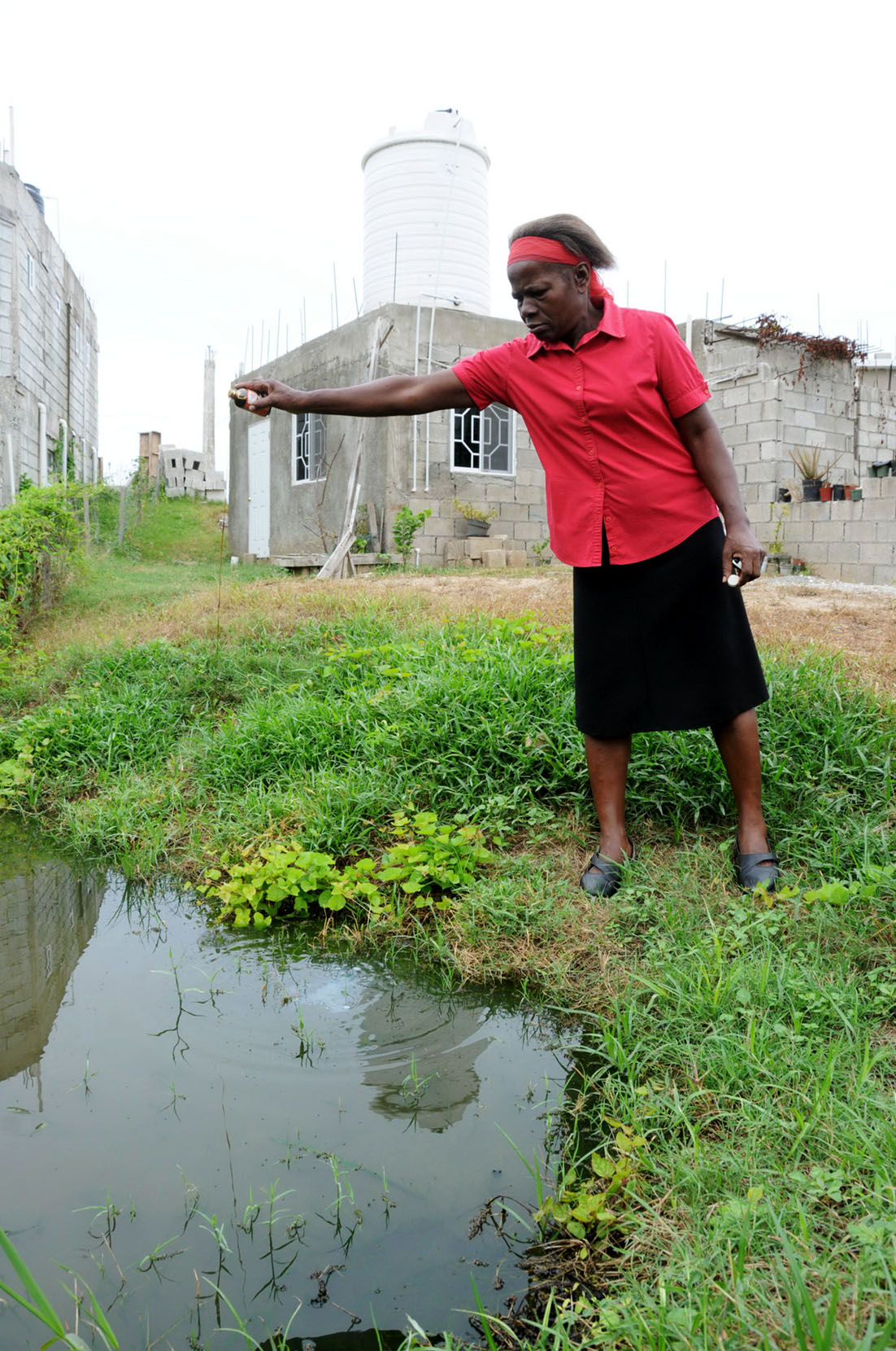 Jermaine Barnaby/Freelance Photographer Juliet Campbell pours Jeyes into a pool of smelly water at the back of her house in Phoenix Vista, Portmore, St Catherine.
