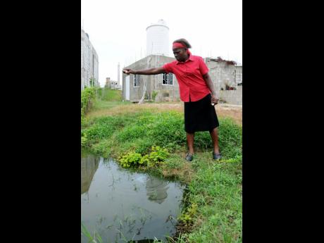 Jermaine Barnaby/Freelance Photographer Jacqueline Watson, a resident of Phoenix Vista in Portmore, St Catherine, shows a pool of sewage water in her yard.