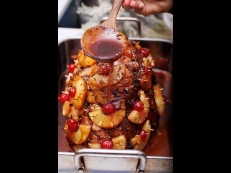 To decorate the ham: Peel off the skin. Use a sharp knife to make diagonal slits in the ham and then stud with remaining cloves. Pour pepper sauce over the surface of the ham and spread evenly using a pastry brush. Return to the oven and bake for a further 10-15 minutes or until a golden brown colour is achieved. Remove ham from the oven.