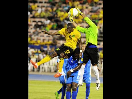 Ian Allen/Photographer Nicaragua's goalkeeper Justo Lorente (right) leaves his line to take the ball ahead of Jamaica's Demar Phillips during a CONCACAF 2018 World Cup Qualifier at the National Stadium. Nicaragua, ranked 139 by FIFA, stunned 52nd ranked Jamaica 3-2.