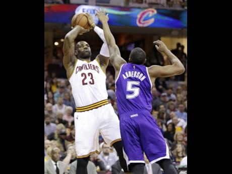 @Normal:Cleveland Cavaliers' LeBron James (23) shoots over Sacramento Kings' James Anderson (5) in the first half of their NBA basketball game on February 8, in Cleveland. The Cavs won 120-100.
