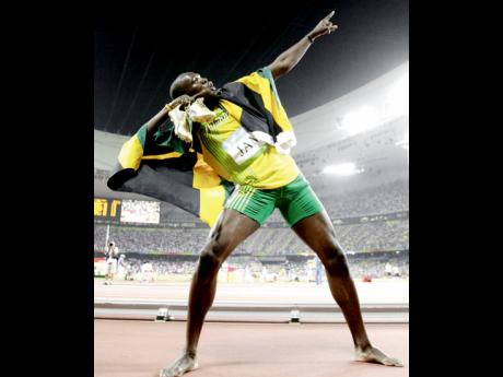 Bolt celebrates his victory in Beijing.