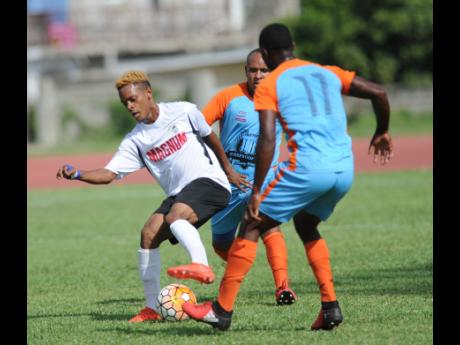 Cavaliers' Alex Marshall (left) turns away from Sandals South Coast players Junior Neil and Ron Daley (right) in their Magnum-Charley's JB-JFF Red Stripe Premier League qualifier at the Stadium East field on July2.