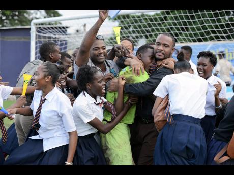 St Andrew Technical High School's goalkeeper and captain, Jeadine White (centre), is hugged by Principal Rayon Simpson (black shirt), coach Phillip Williams (hand raised) and fellow students after his two saves and scoring from the spot helped his team to a 4-3 penalty shootout win over St George's College in their Manning Cup playoff at Constant Spring Sports Complex.