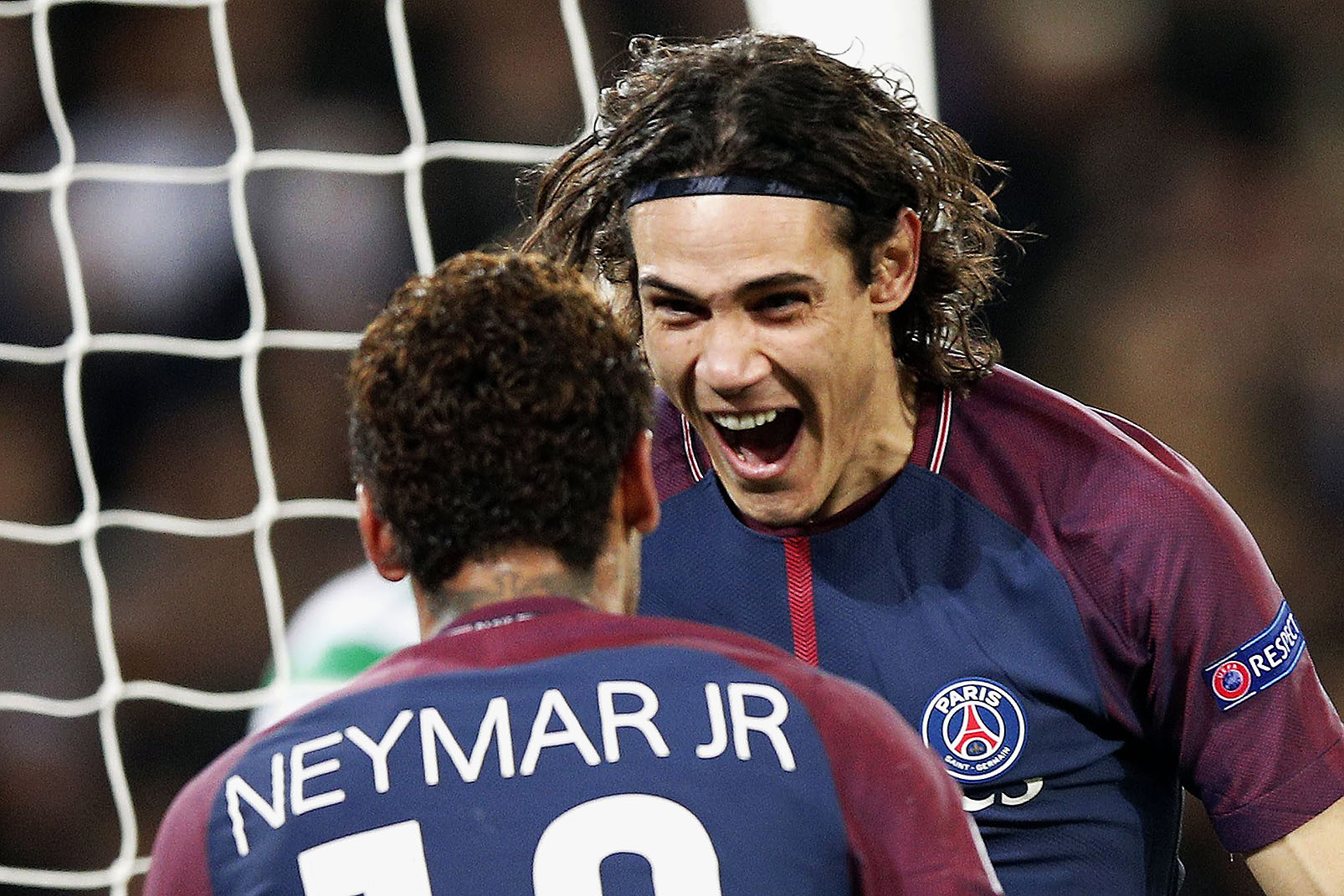 Paris St Germain's Edinson Cavani (right) celebrates with his teammate Neymar after scoring.