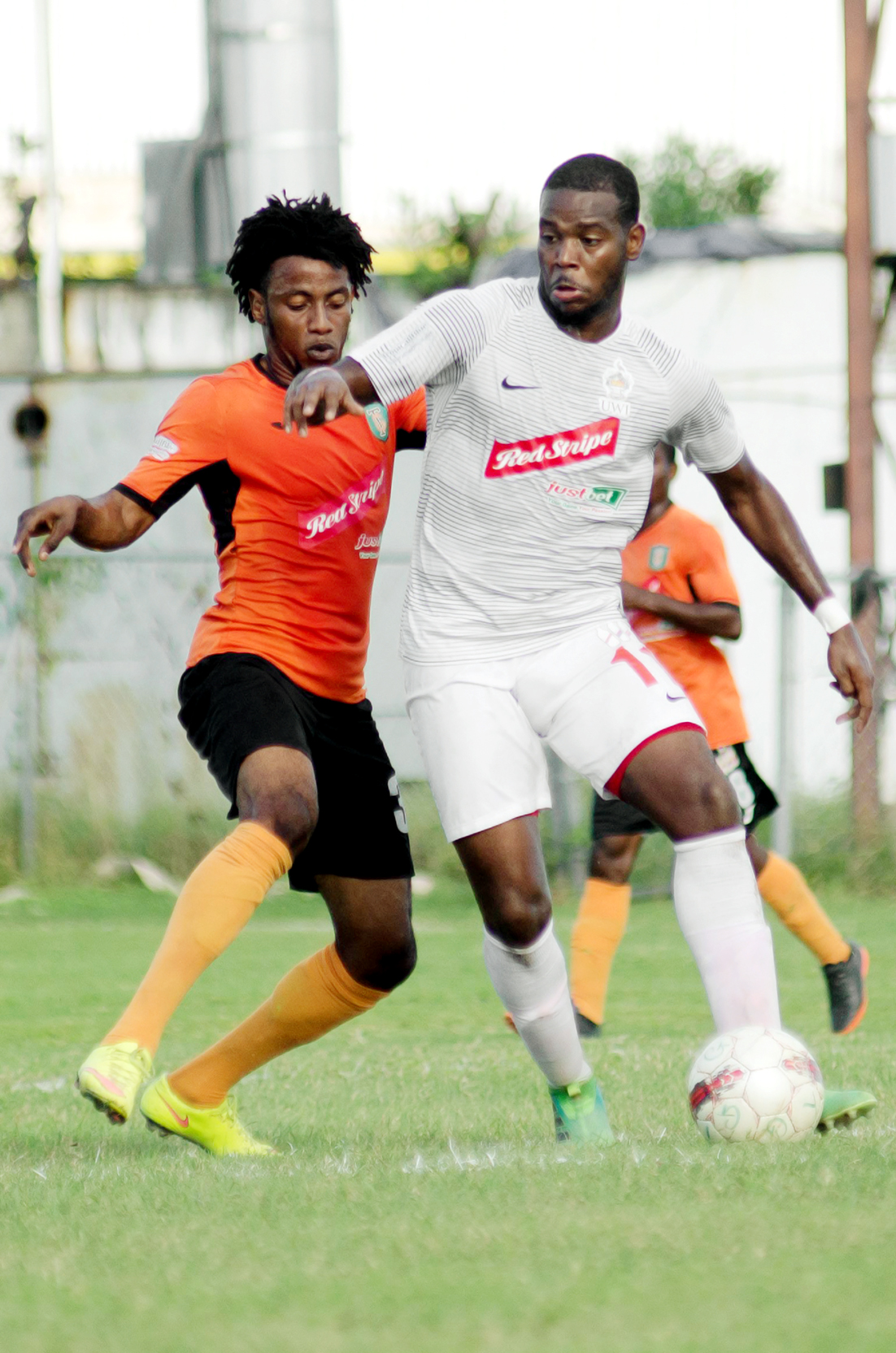 Shorn Hector/Photographer Tivoli Garden's Tevin Shaw (left) being sheilded by UWI F.C.'s Dawyne Smith at the Edward Seaga Sports Complex on December 17.