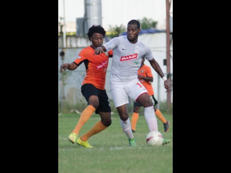 @Normal:Humble Lion's Craig Foster (left) in action against Ricardo Dennis of Boys' Town during a recent Red Stripe Premier League match.