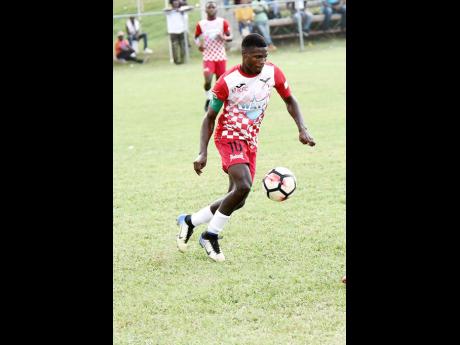 Shackeil Fuller (right) of Charlemont shields the ball from Petersfield High School's Shewayne Barton while his Charlemont teammate, Tajuan Wright, looks on in the final of the ISSA/WATA Ben Francis Knockout Cup at the Juici Patties Park in Clarendon on November 23. Charlemont led 2-0 at half-time when rain interrupted play.